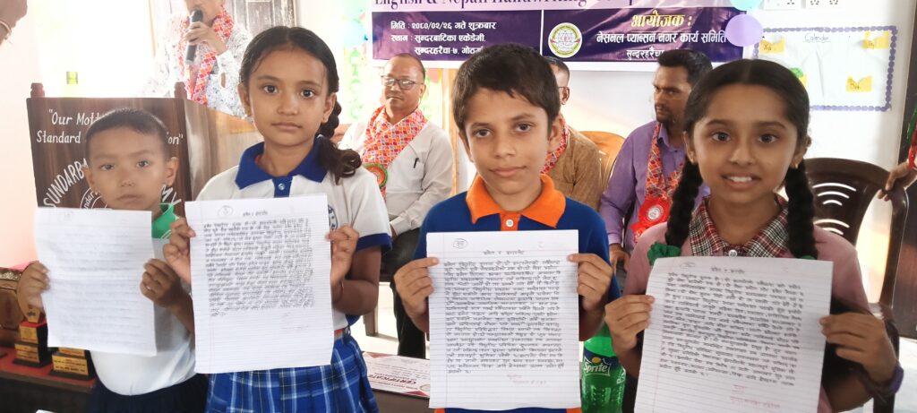 त्यसै गरी नेपाली हस्तलेखन तर्फ सुन्दरबाटिका स्कुलका कक्षा ५ मा अध्यनरत छात्रा केन्द्रिका फुयल प्रथम र सो बिधालयका अंग्रेजी हस्तलेखन तर्फ कक्षा ४ मा अध्यरत छात्रा प्रशंसा रिजाला तृतीय भएकी छिन।