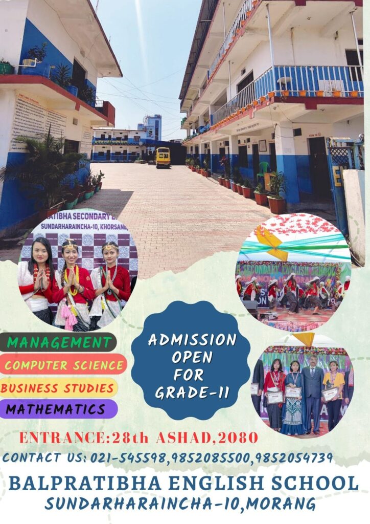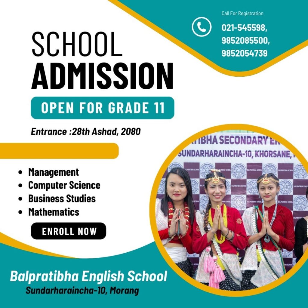 मोरङ जिल्लाको सुन्दरहरैंचा नगरपालिका वडा १० खोर्सानेमा रहेको नगरकै नमुना र गौरव बोकेको बाल प्रतिभा माध्यमिक अंग्रेजी बिद्यालयमा नयाँ शैक्षिक सत्रका लागि कक्षा ११ मा भर्ना खुलेको छ।